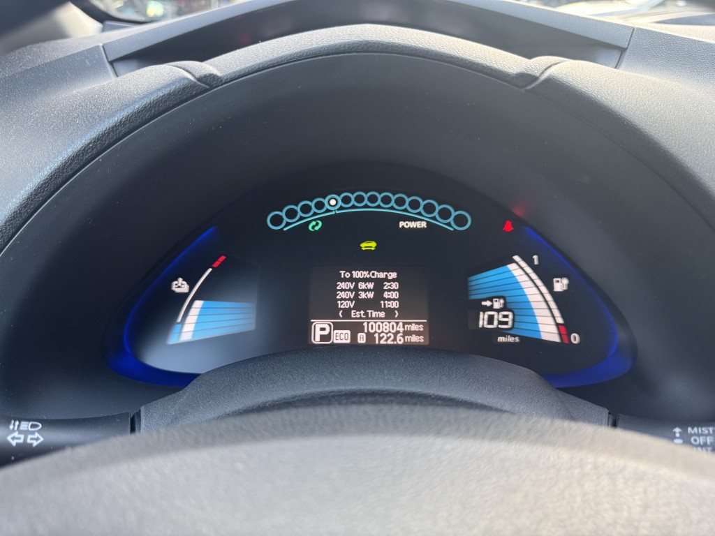 2016 Nissan Leaf SV with a clean Carfax and only two previous owners. Options include power locks, power windows, power mirrors, alloy wheels, cruise control, Bluetooth, steering wheel controls, a backup camera, navigation, and a charging cord. This vehicle has 100,791 miles and is priced at $4,995. If you are interested in a test drive, please call 657-230-7502 to check for vehicle availability or visit us at dandmauto.com